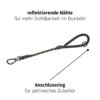 Das Seilmaterial verfügt über integrierte reflektierende Nähte, die in Dunkelheit oder bei Nebel deutlich hervorstechen. Das erhöht die Sichtbarkeit von Deinem Hund und Dir und bietet ein Plus an Sicherheit. Am Griff findet sich ein Anschlussring für Zubehör.