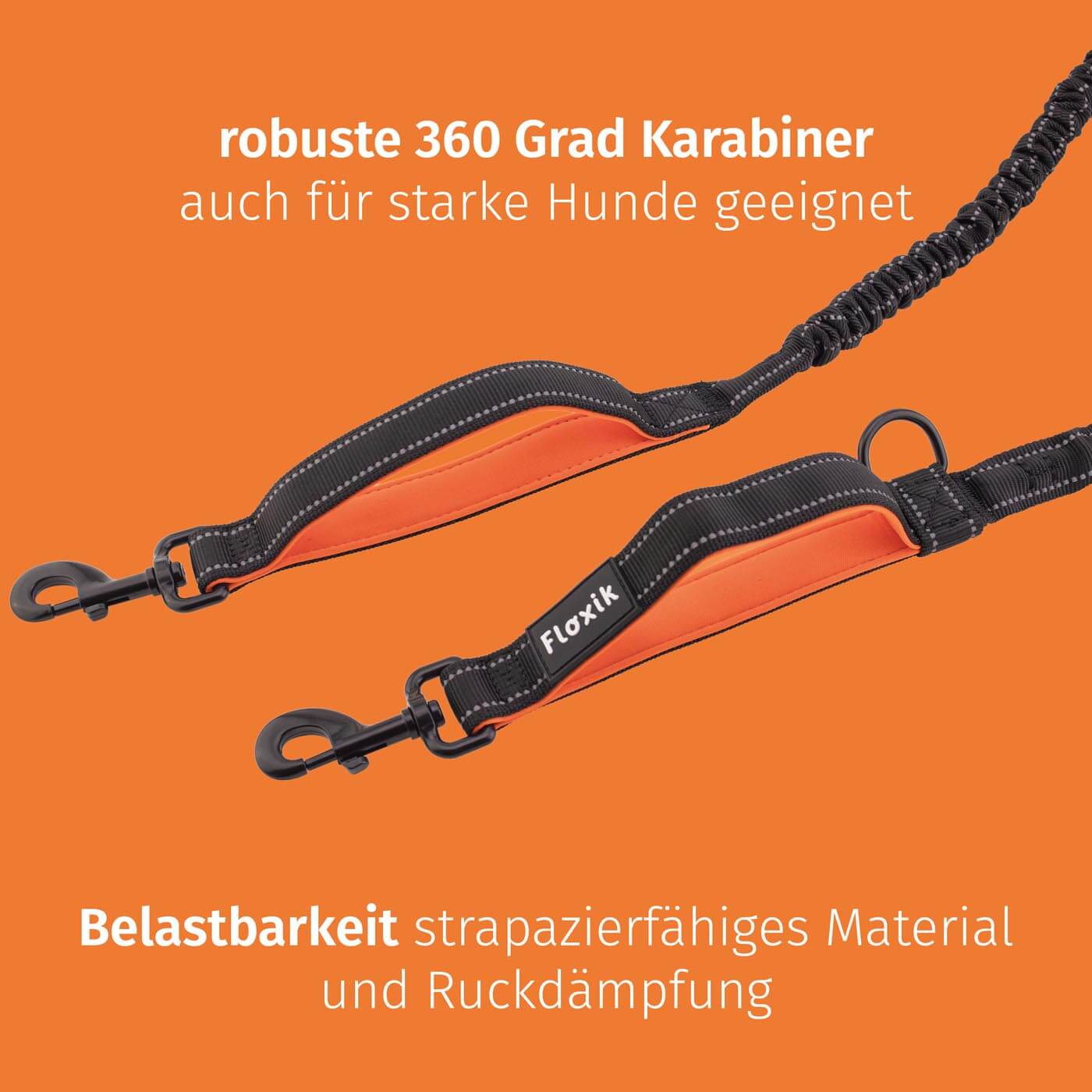 Hochwertige Materialien und stabile Verarbeitung machen die Floxik Joggingleine besonders langlebig und ideal für mittelgroße bis große, kräftige Hunde.