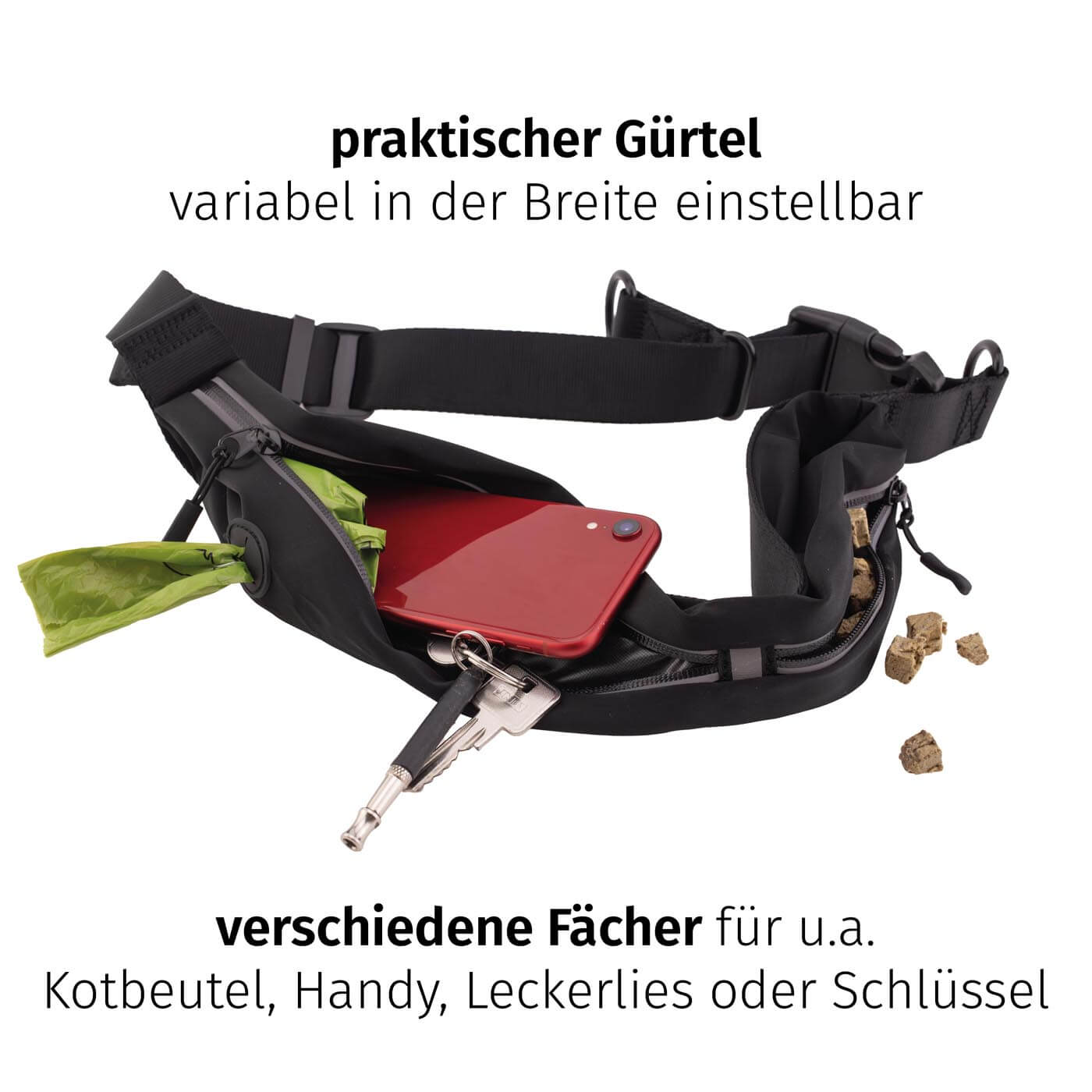 Der ergonomische Gürtel sitzt bequem und sicher, ohne einzuschneiden. In den zwei praktischen Taschen kannst du wichtige Dinge wie Smartphone, Schlüssel oder Leckerlis verstauen – perfekt für unterwegs.